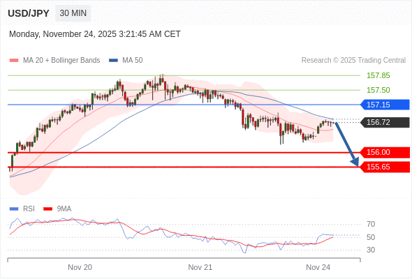 在 157.15 之下,看跌,目标价位为 156.00 ,然后为 155.65 。